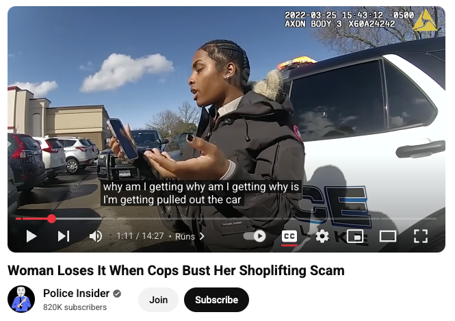Next up is a somewhat similar confrontation (they all begin to look alike after watching a couple) but with the drama turned up involving two women picked up outside a store for a multi-jurisdictional shoplifting spree. The big girl is lucky she didn’t get tazed, and the small one is nearly off the chain, dudgeon at levels unseen since the Great Dudgeon of ’08. Note the non-stop stream of questions interrupted only by accusations and the occasional compressor stall where her mouth has outrun her brain despite saying the same thing over and over.